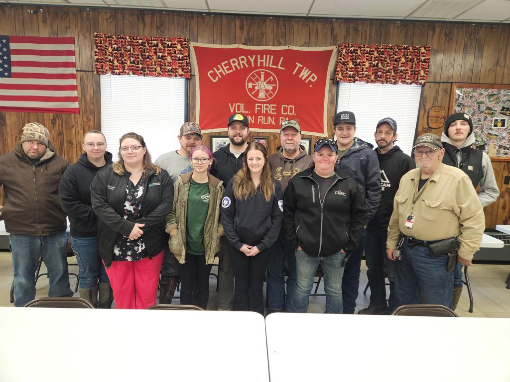 Cherryhill firefighters who completed the recertification are Bill Cochran, John Rainey, Jody Rainey, Isaac Foreback, Jr. Sabo, Bre Dixon, Tom Crusan, Cassi Newman, Konstance Smeltzer, Allie Ringler, Jason Geneva, Nathan Rainey, Paige Smith, and Julian Shultz. The instructor was Cherryhill QRS-EMT Jim Sadler. |